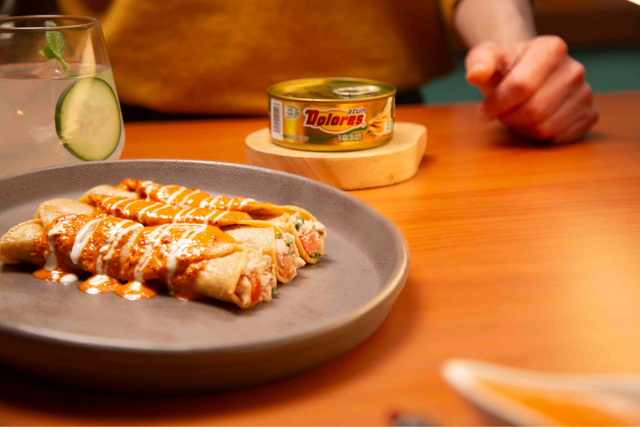 2. Para la salsa, calienta el aceite del Atún Dolores en una sartén, agrega los chiles secos, el ajo y la cebolla, y fríelos por unos minutos. Licúa estos ingredientes fritos con un poco de agua caliente hasta obtener una salsa suave.
