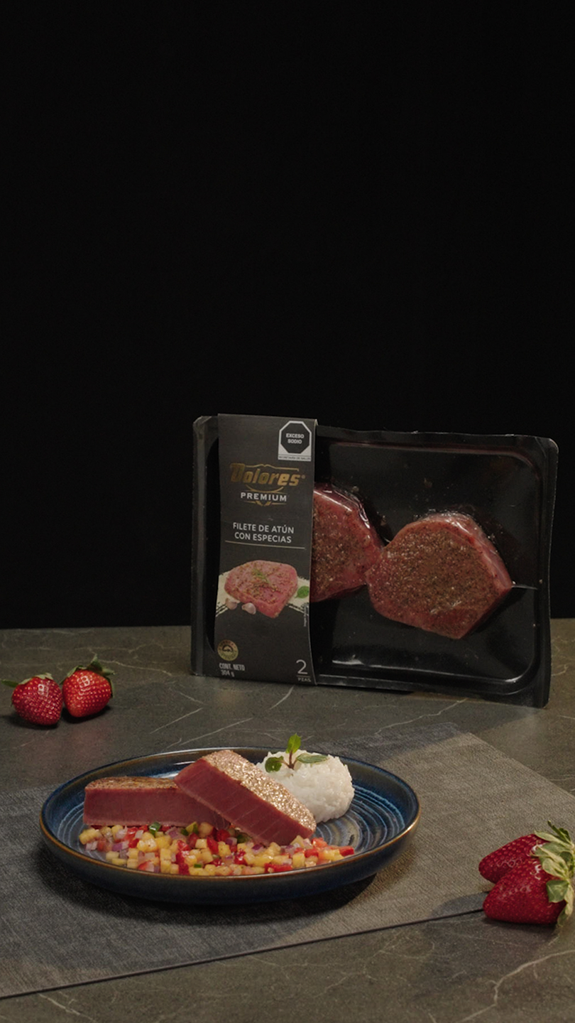 2. En una sartén caliente con aceite de aguacate, se sella el filete de Atún Dolores Premium con especias por ambos lados hasta que adquiera una costra dorada, manteniendo su jugosidad.