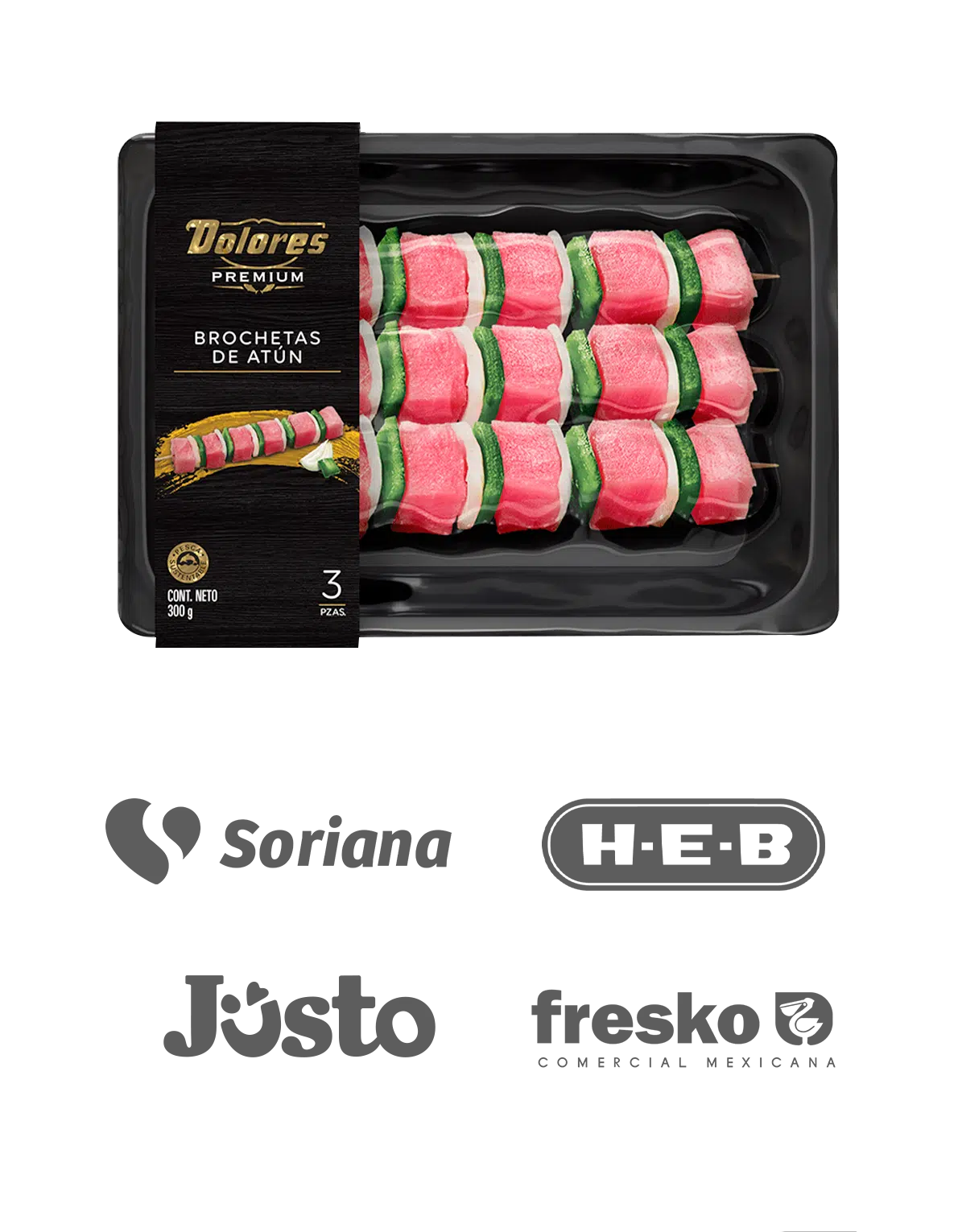 Las Brochetas de Atún Dolores Premium son una excelente opción para disfrutar de un antojo saludable, contiene 3 piezas de 100g c/u, hechas con cubos de atún fresco de Lomo de Atún Aleta Amarilla, cebolla y pimiento morrón, ofreciendo un delicioso sabor.